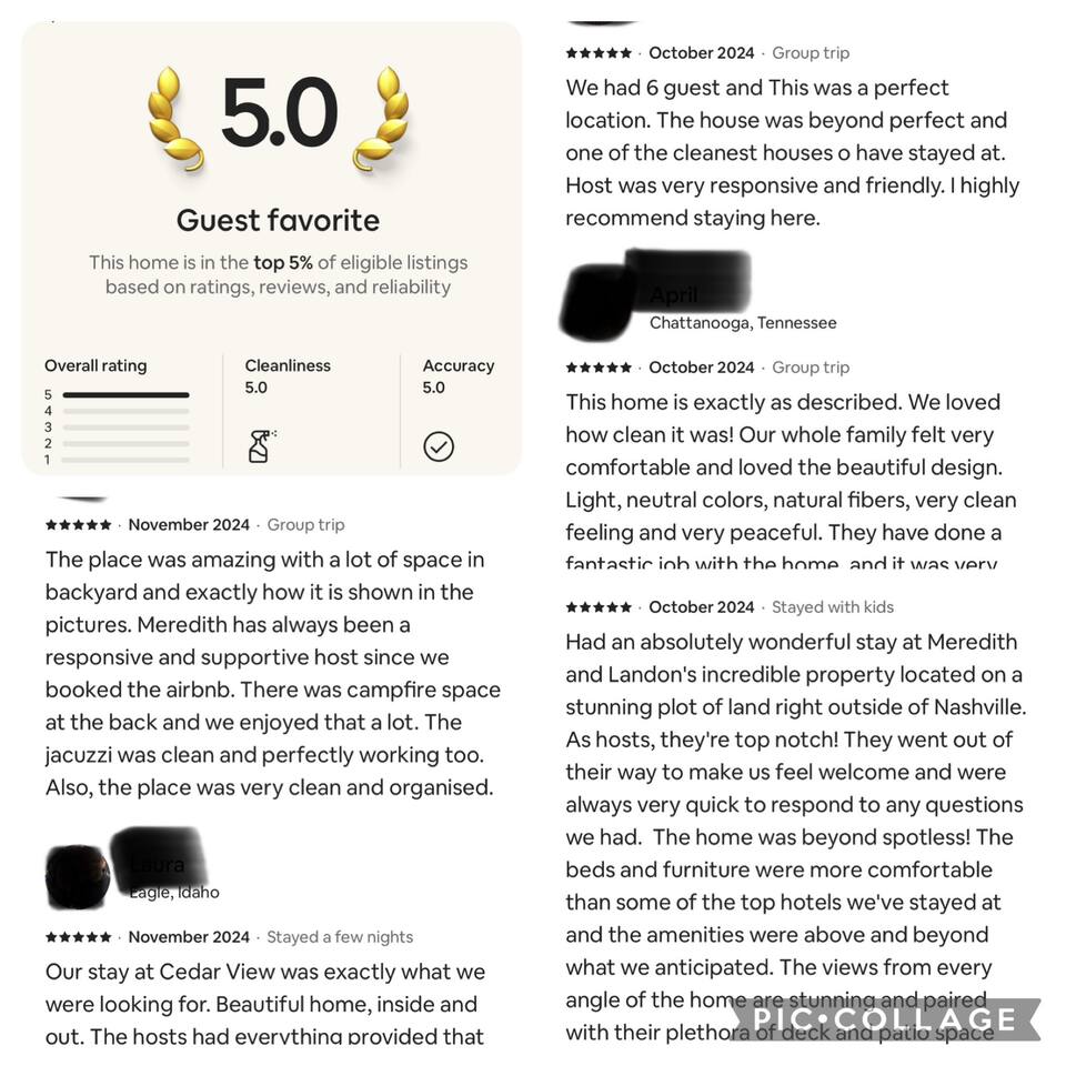 Our home is located on 6 beautiful, wooded acres, which means you may encounter wildlife and critters such as deer, squirrels, rodents, insects (including flying insects), reptiles, and more. While we have a pest control service that visits quarterly and as needed, we cannot guarantee the absence of such critters in and around the property. Please note that the presence of these critters does not entitle guests to a refund. When visiting Tennessee, we recommend familiarizing yourself and your group with the local wildlife, including reptiles and insects, to ensure a safe and enjoyable stay. If you’re not a Tennessee resident, it’s important to research the wildlife native to this area in advance. Additional Notes for Your Stay: Trash Pickup: Trash is collected early on Thursday mornings. We’ll remind you on Wednesday evening to ensure vehicles aren’t blocking access to the trash area. Mid-Term Stays: For stays longer than three weeks, complimentary mid-stay cleanings are provided. Property Maintenance: Lawn care and hot tub maintenance will take place on the property as needed. We’re committed to making your stay as comfortable and enjoyable as possible and appreciate your understanding of our property’s natural surroundings.